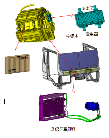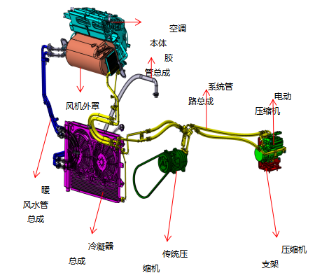 空调本体、风机外罩、暖风管路总成、系统管路总成、冷凝器总成、传统压缩机、电动压缩机、压缩机支架、胶管总成等零部件产品。